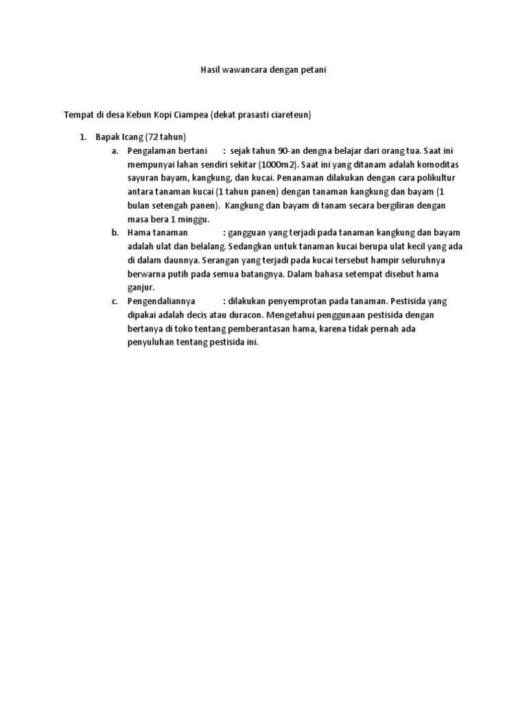 Beliau bernama edi ngatemin, berumu. Berikut ini adalah contoh dari teks wawancara antara seorang mahasiswa dengan wirausaha muda yang sedang merintis bisnisnya. (aktivitas apa yang anda lakukan sebagai seorang petani?) Karana jual beli padi di musim panen hanya ada dua pilihan yaitu per kilo dan tebasan, kalo menjual padi per kilo petani harus membayar biaya tenaga . Contoh pertanyaan wawancara dengan petani padi singkong cabai tomat kacang sayuran bahasa sunda untuk mewawancarai seorang petani misalnya .